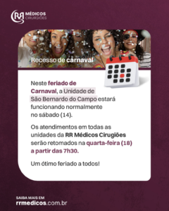 Neste feriado de Carnaval, a Unidade de São Bernardo do Campo estará funcionando normalmente no sábado (14). Os atendimentos em todas as unidades da RR